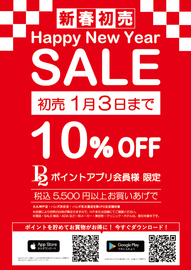 P2各店では、初売り~1月3日の期間中「P2アプリ会員さま限定 HAPPY NEW YEAR SALE(税込5,500円以上のお買い上げで10%OFF)」を開催いたします。