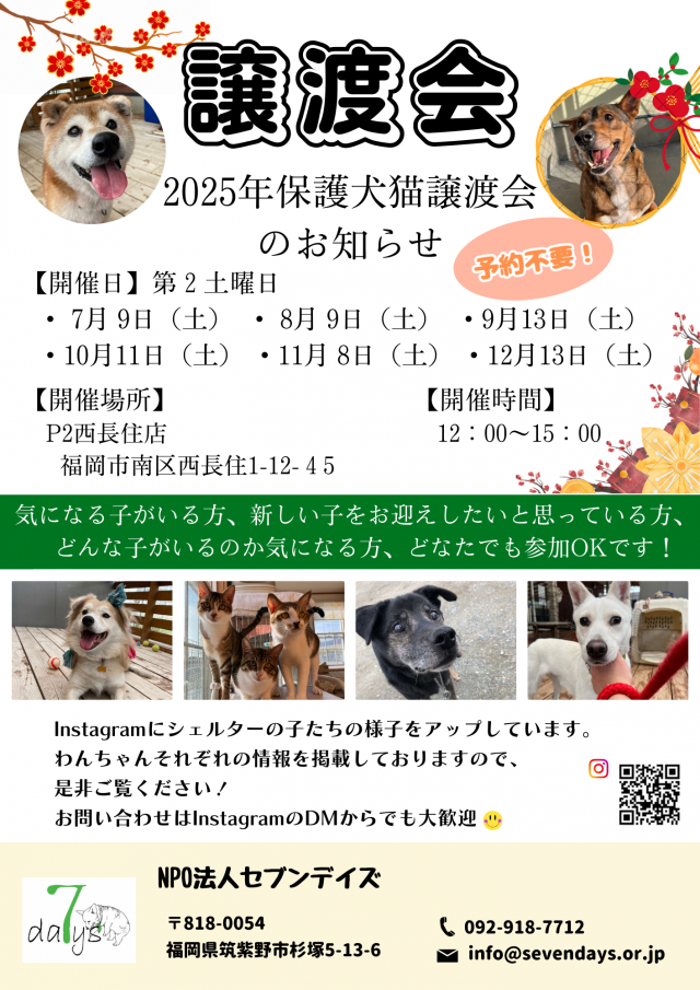 NPO法人セブンデイズさまによる「保護犬・保護猫 譲渡会(事前予約不要)」が、2025年11月8日(土)に P2 西長住店 Love Nature Charity棟にて開催されます。