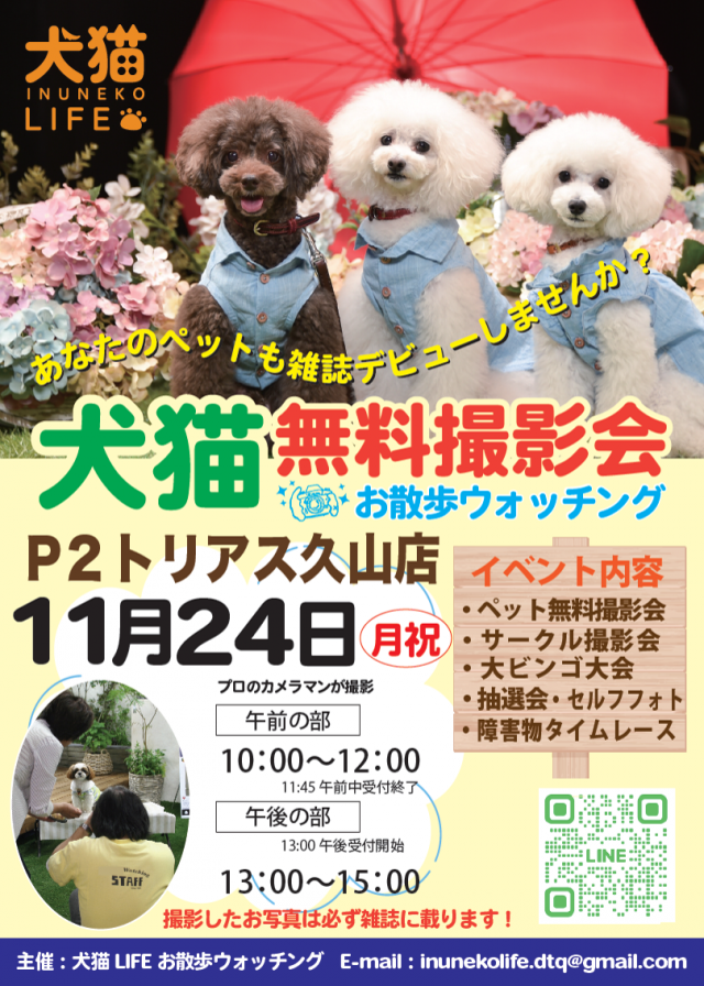 【再掲】11月24日開催「犬猫LIFE 無料撮影会(P2トリアス久山店)」