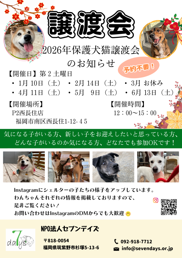 2026年1月10日(土)P2 西長住店 Love Nature Charity棟にて、NPO法人セブンデイズさまによる「保護犬・保護猫 譲渡会(事前予約不要)」が開催されます。素敵な出会いがありますように✨● セブンデイズさま公式Instagram コチラ