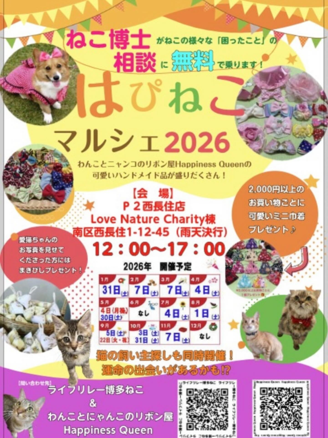 ライフリレー博多ねこさまによる「はぴねこマルシェ2026(ねこ博士のなんでも相談室・譲渡会・チャリティグッズ販売)」が、2026年1月31日(土)に、P2 西長住店 Love Nature Charity棟にて開催されます。