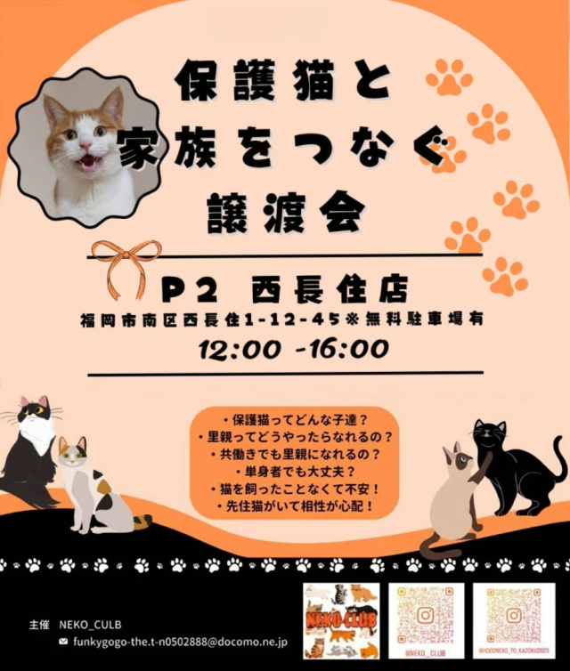 2026年2月11日(水/祝)P2 西長住店 Love Nature Charity棟にて、NEKO_CLUBさま主催による「保護猫と家族をつなぐ譲渡会」が開催されます。